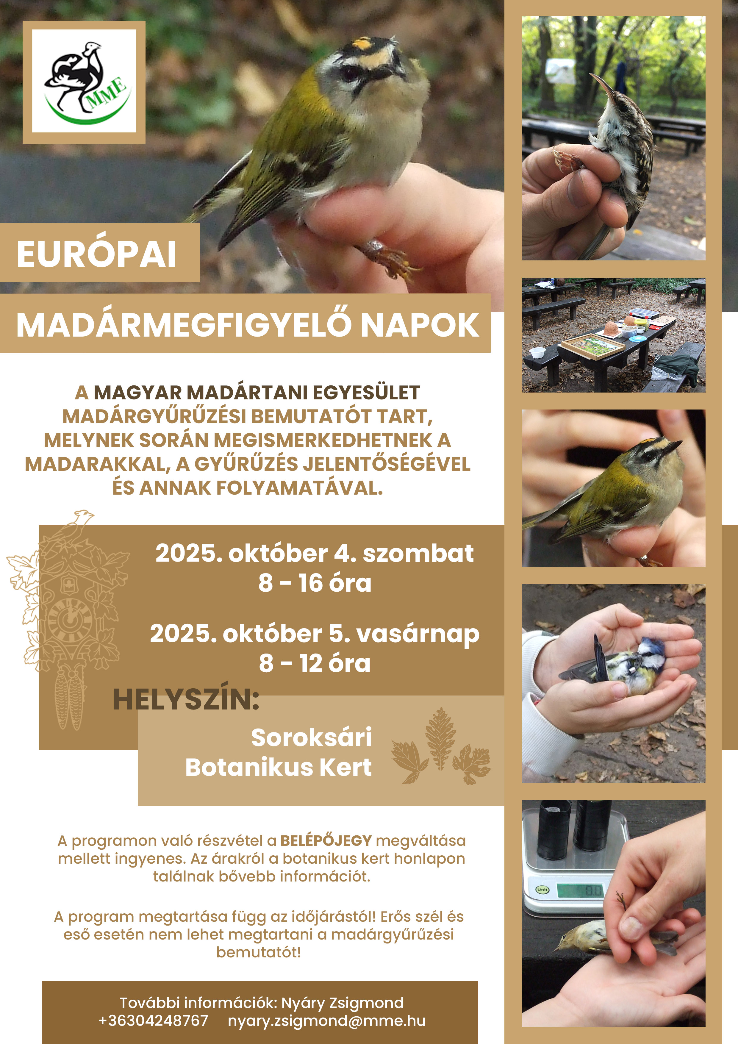 Madárgyűrűzési bemutatót szervez a Magyar Madártani Egyesület a Soroksári Botanikus kertbe az Európai Madármegfigyelő Napok keretében.